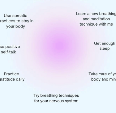 Breath Work practices to become oriented, and to shift our state of mind when becoming blocked, increase ability to resource to become more alert or more relaxed as needed using different techniques.